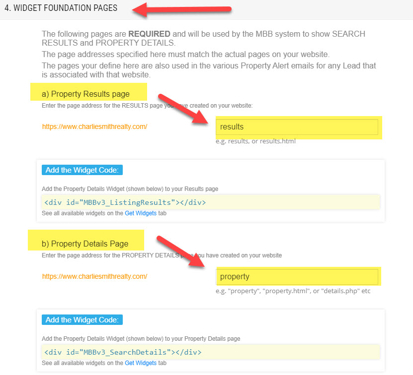 Then click the “Website Settings” link for your website. - Scroll down to section “4. WIDGET FOUNDATION PAGES” to review the page addresses of the Widget Foundation pages