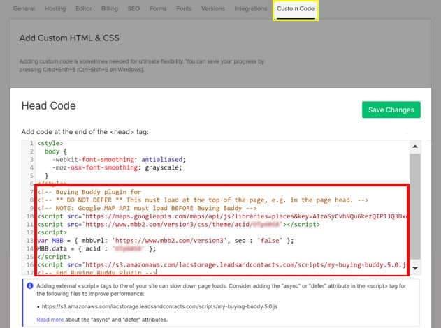 - Paste the Buying Buddy JavaScript code (see above) in the HEAD CODE panel and and then click SAVE CHANGES.