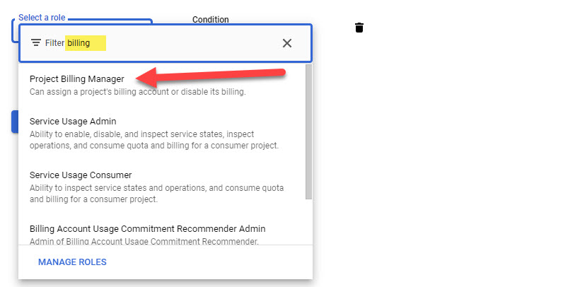 To select this new role, click the ‘Role’ button to show the roles – and type ‘billing’ in the filter as shown below. Then select “Project Billing Manager” and SAVE