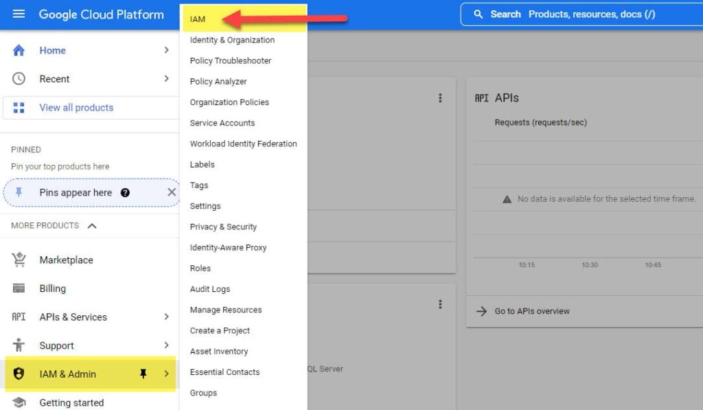 Then, click the 3-bar menu icon in the top left of the top blue bar to open the main menu on the left and go to “IAM & Admin” – and in the pop-out menu – select the top item “IAM”.